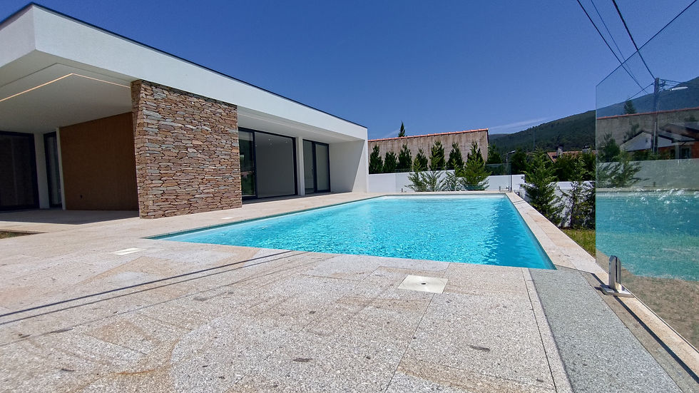 Zona de estar , com grandes zonas envidraçadas que "fundem" com area externa coberta e piscina , criando um espaço perfeito para relaxar e se divertir.